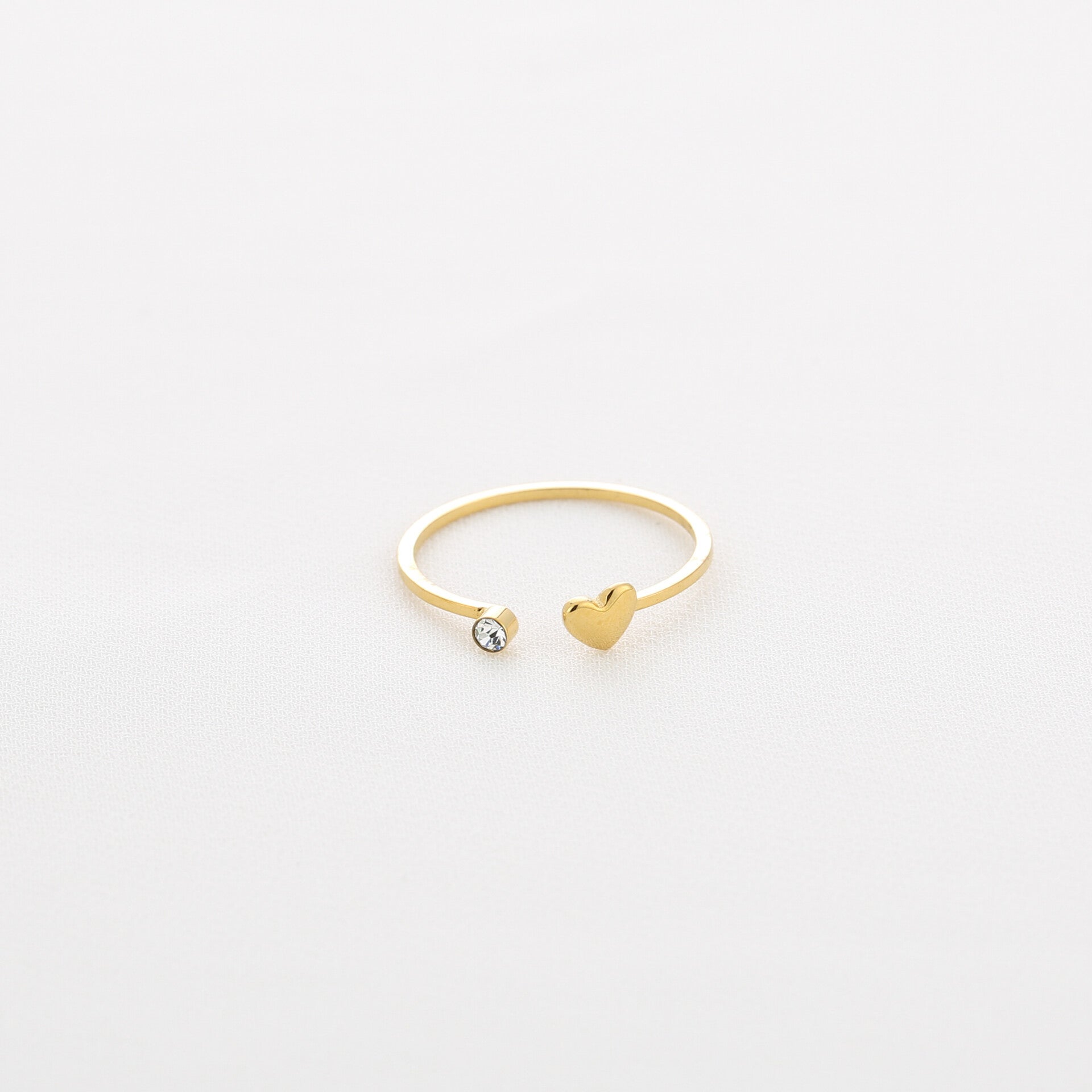 Ring met een klein hartje en steentje. Deze ring is gemaakt van roestvrij staal en is verstelbaar. Wij raden de ring aan van ringmaat 16 tot en met 18.